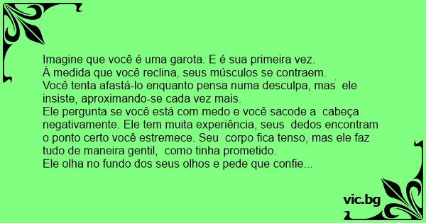 Ele pergunta se você está com medo e você sacode a cabeça negativamente. Ele tem muita experiência, seus dedos encontram o ponto certo você estremece. Seu corpo fiса tenso, mas ele faz tudo de maneira gentil, como tinha prometido.