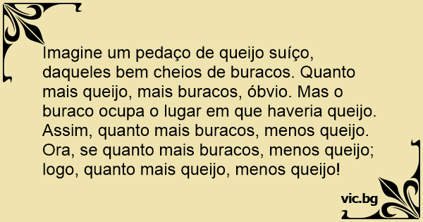 Imagine um pedaço de queijo suíço, daqueles bem cheios de buracos. Quanto mais queijo, mais buracos, óbvio. Mas o buraco ocupa o lugar em que haveria queijo. Assim, quanto mais buracos, menos queijo. Ora, se quanto mais buracos, menos queijo; logo, quanto mais queijo, menos queijo!