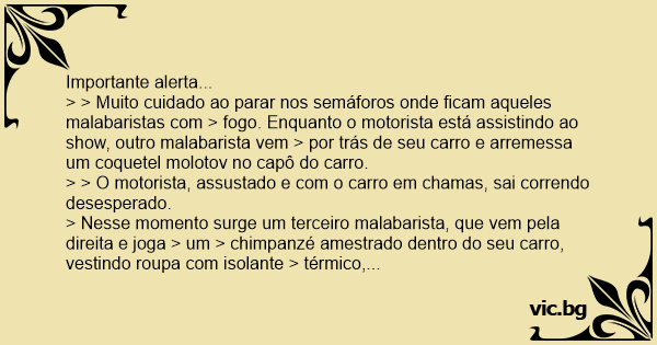 > > Muito cuidado ao parar nos semáforos onde ficam aqueles malabaristas com > fogo. Enquanto o motorista está assistindo ao show, outro malabarista vem > por trás de seu carro e arremessa um coquetel molotov no capô do carro.