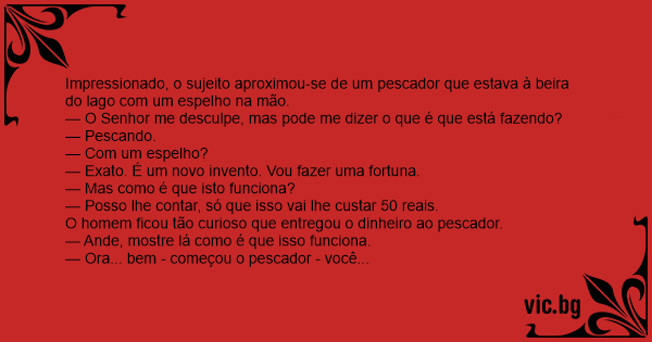 Impressionado, o sujeito aproximou-se de um pescador que estava à beira do lago com um espelho na mão.