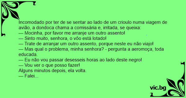 Incomodado por ter de se sentar ao lado de um crioulo numa viagem de avião, a dondoca chama a comissária e, irritada, se queixa: