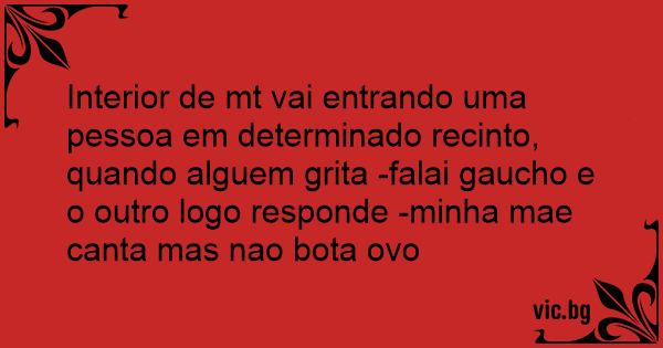 Interior de mt vai entrando uma pessoa em determinado recinto, quando alguem grita -falai gaucho e o outro logo responde -minha mae canta mas nao bota ovo