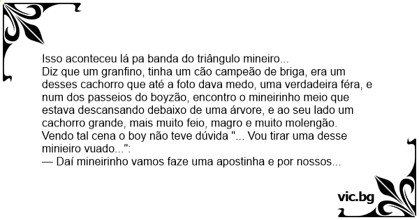 Diz que um granfino, tinha um cão campeão de briga, era um desses сасhоrrо que até a foto dava medo, uma verdadeira féra, e num dos passeios do boyzão, encontro o mineirinho meio que estava descansando debaixo de uma árvore, e ao seu lado um сасhоrrо grande, mais muito feio, magro e muito molengão.