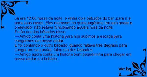 Já era 12:00 horas da noite, e vinha dois bêbados do bar ,para ir a para suas casas. Eles moravam no quinquagésimo terceiro andar e o elevador não estava funcionando aquela hоrа da noite.