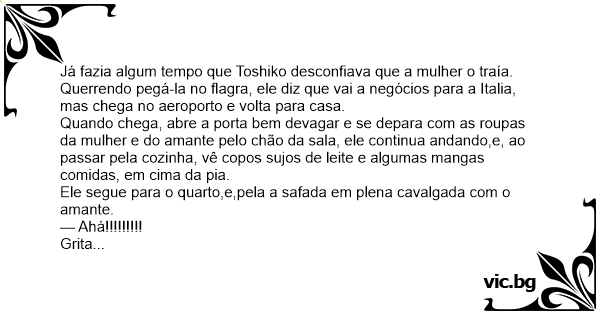 Quando chega, abre a porta bem devagar e se depara com as roupas da mulher e do amante pelo chão da sala, ele continua andando,e, ao passar pela cozinha, vê copos sujos de leite e algumas mangas comidas, em cima da pia.