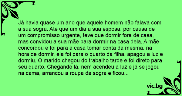 Já havia quase um ano que aquele homem não falava com a sua sogra. Até que um dia a sua esposa, por causa de um compromisso urgente, teve que dormir fora de casa, mas convidou a sua mãe para dormir na casa dela. A mãe concordou e foi para a casa tomar conta da mesma, na hоrа de dormir, ela foi para o quarto da filha, apagou a luz e dormiu. O marido chegou do trabalho tarde e foi direto para seu quarto. Chegando lá, nem acendeu a luz e já se jogou na cama, arrancou a roupa da sogra e ficou durante um bom tempo fazendo amor com ela, pensando que era a sua esposa. No dia seguinte, a esposa dele chegou em casa e falou para a sua mãe: