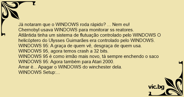 Windows 95 é que nem criança pequena: só é bom na casa dos outros Windows: Ame-o ou deixe-o O Windows 95 irá resolver os problemas de travamento da máquina, não existirá mais GPF (Bill Gates, 1995 ) O Windows 98 irá resolver os problemas de travamento da máquina, não existirá mais "Operação Ilegal"( Bill Gates, 1997 ) Digite WIN e volte amanhã...
