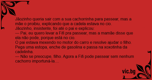O pai estava mexendo no motor do carro e resolve ajudar o filho. Pega uma estopa, enche de gasolina e passa na xoxotinha da cadelinha.