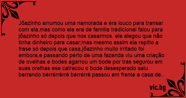 Jõazinho arrumou uma namorada e éra louco para transar com ela,mas como ela era de familia tradicional falou para jõazinho só depois que nos casarmos. ele alegou que não tinha dinheiro para casar;mas mesmo assim ela repitio a frase só depois que casa,jõazinho muito irritado foi embora,e passando perto de uma fazenda viu uma criação de ovelhas e bodes agarrou um bode por tras segurou em suas orelhas ese catracou o bode desesperado saiu berrando bérrérrérré bérrérré passou em frente a casa de sua namorada éla quando viu chamou seu pai e falou:papai dinheiro para casar ele não tem mas comprou uma moto tenerééééééééé