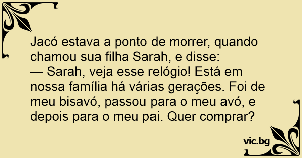 — Sarah, veja esse relógio! Está em nossa família há várias gerações. Foi de meu bisavó, passou para o meu avó, e depois para o meu pai. Quer comprar?