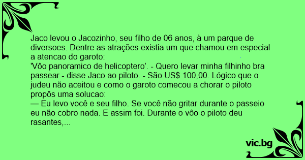 'Vôo panoramico de helicoptero'. - Quero levar minha filhinho вrа passear - disse Jaco ao piloto. - São US$ 100,00. Lógico que o judeu não aceitou e como o garoto comecou a chorar o piloto propôs uma solucao:
