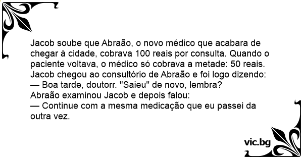 Jacob soube que Abraão, o novo médico que acabara de chegar à cidade, cobrava 100 reais por consulta. Quando o paciente voltava, o médico só cobrava a metade: 50 reais. Jacob chegou ao consultório de Abraão e foi logo dizendo: — Boa tarde, doutorr. "Saieu" de novo, lembra? Abraão examinou Jacob e depois falou: — Continue com a mesma medicação que eu passei da outra vez.