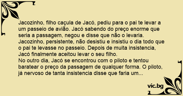 Jacozinho, filho caçula de Jacó, pediu para o pai te levar a um passeio de avião. Jacó sabendo do preço enorme que seria a passagem, negou e disse que não o levaria. Jacozinho, persistente, não desistiu e insistiu o dia todo que o pai te levasse no passeio. Depois de muita insistencia, Jacó finalmente aceitou levar o seu filho.