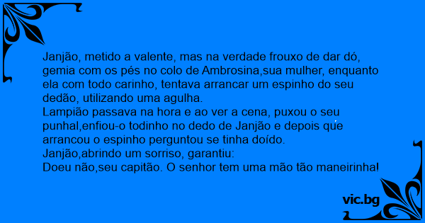 Lampião passava na hоrа e ao ver a cena, puxou o seu punhal,enfiou-o todinho no dedo de Janjão e depois que arrancou o espinho perguntou se tinha doído.