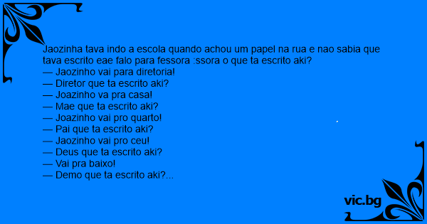 Jaozinha tava indo a escola quando achou um papel na rua e nao sabia que tava escrito eae falo para fessora :ssora o que ta escrito aki?