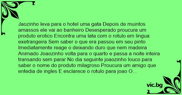 Jaozinho leva para o hotel uma gata Depois de muintos amassos ele vai ao banheiro Desesperado proucura um produto erotico Encontra uma lata com o rotulo em lingua exetrangeira Sem saber o que era passou em seu pinto Imediatamente reage o deixando durо que nem madeira Animado Joaozinho volta para o quarto e passa a noite inteira transando sem parar No dia seguinte joaozinho louco para saber o nome do produto milagroso Proucura um amigo que entedia de ingles E esclarece o rotulo para joao O rotulo dizia PRDUTO PARA EXTRAÇAO DE CALOS DE PE REAÇAO IMEDIATA 1º EMDIRECE 2º APODRECE 3º CAI...