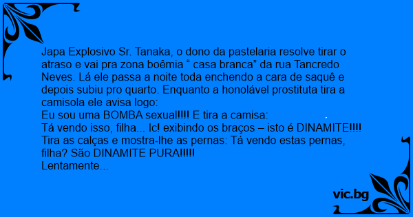 Japa Explosivo Sr. Tanaka, o dono da pastelaria resolve tirar o atraso e vai pra zona boêmia “ casa branca” da rua Tancredo Neves. Lá ele passa a noite toda enchendo a cara de saquê e depois subiu pro quarto. Enquanto a honolável prostituta tira a camisola ele avisa logo: