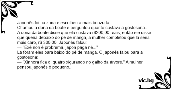 A dona da boate disse que ela custava r$200,00 reais, então ele disse que queria debaixo do pé de manga, a mulher completou que lá seria mais caro, r$ 300,00. Japonês falou: