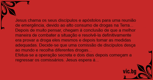Jesus chama os seus discípulos e apóstolos para uma reunião de emergência, devido ao alto consumo de drogas na Terra...