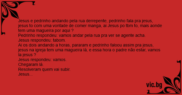 Jesus e pedrinho andando pela rua derrepente, pedrinho fala pra jesus, jesus to com uma vontade de comer manga, ai Jesus po tbm to, mais aonde tem uma magueira por aqui ?