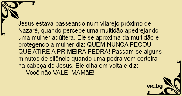 Jesus estava passeando num vilarejo próximo de Nazaré, quando percebe uma multidão apedrejando uma mulher adúltera. Ele se aproxima da multidão e protegendo a mulher diz: QUEM NUNCA PECOU QUE ATIRE A PRIMEIRA PEDRA! Passam-se alguns minutos de silêncio quando uma pedra vem certeira na cabeça de Jesus. Ele olha em volta e diz: