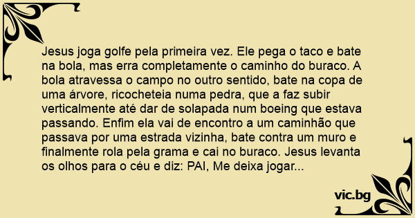 Jesus joga golfe pela primeira vez. Ele pega o taco e bate na bola, mas erra completamente o caminho do buraco. A bola atravessa o campo no outro sentido, bate na copa de uma árvore, ricocheteia numa pedra, que a faz subir verticalmente até dar de solapada num boeing que estava passando. Enfim ela vai de encontro a um caminhão que passava por uma estrada vizinha, bate contra um muro e finalmente rola pela grama e cai no buraco. Jesus levanta os olhos para o céu e diz: PAI, Me deixa jogar sozinho...