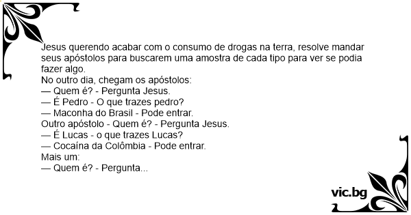 Jesus querendo acabar com o consumo de drogas na terra, resolve mandar seus apóstolos para buscarem uma amostra de cada tipo para ver se podia fazer algo.