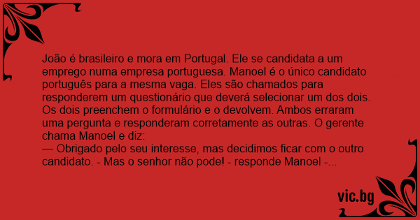 João é brasileiro e mora em Portugal. Ele se candidata a um emprego numa empresa portuguesa. Manoel é o único candidato português para a mesma vaga. Eles são chamados para responderem um questionário que deverá selecionar um dos dois. Os dois preenchem o formulário e o devolvem. Ambos erraram uma pergunta e responderam corretamente as outras. O gerente chama Manoel e diz: