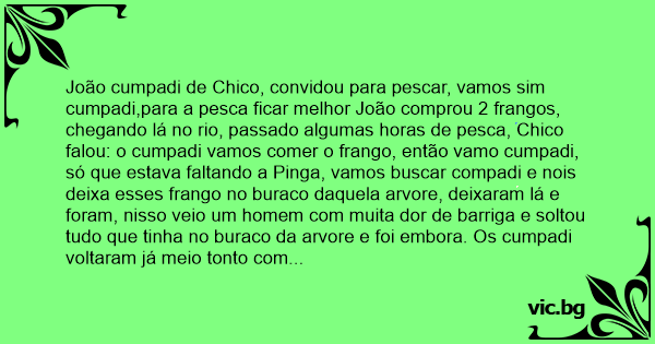 João cumpadi de Chico, convidou para pescar, vamos sim cumpadi,para a pesca ficar melhor João comprou 2 frangos, chegando lá no rio, passado algumas horas de pesca, Chico falou: o cumpadi vamos comer o frango, então vamo cumpadi, só que estava faltando a Pinga, vamos buscar compadi e nois deixa esses frango no buraco daquela arvore, deixaram lá e foram, nisso veio um homem com muita dor de barriga e soltou tudo que tinha no buraco da arvore e foi embora. Os cumpadi voltaram já meio тоnто com a garrafa na mão e começaram a beber piga e comer frango, beber pinga e comer frango, beber frango e comer pinga, quando chico virá para João e pergunta: O cumpadi, quantos frangos o senhor comprou, ah! cumpadi só foi 2, porque?