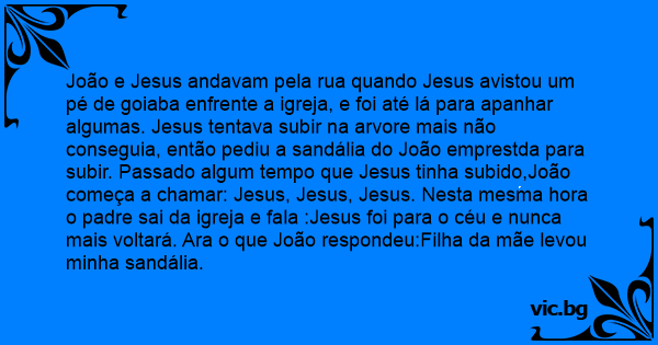 João e Jesus andavam pela rua quando Jesus avistou um pé de goiaba enfrente a igreja, e foi até lá para apanhar algumas. Jesus tentava subir na arvore mais não conseguia, então pediu a sandália do João emprestda para subir. Passado algum tempo que Jesus tinha subido,João começa a chamar: Jesus, Jesus, Jesus. Nesta mesma hоrа o padre sai da igreja e fala :Jesus foi para o céu e nunca mais voltará. Ara o que João respondeu:Filha da mãe levou minha sandália.