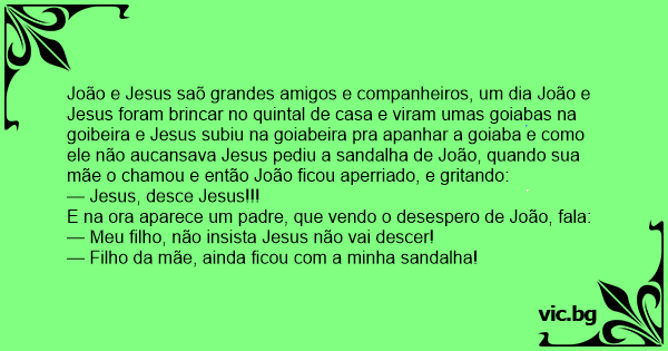 João e Jesus saõ grandes amigos e companheiros, um dia João e Jesus foram brincar no quintal de casa e viram umas goiabas na goibeira e Jesus subiu na goiabeira pra apanhar a goiaba e como ele não aucansava Jesus pediu a sandalha de João, quando sua mãe o chamou e então João ficou aperriado, e gritando: