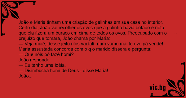 João e Maria tinham uma criação de galinhas em sua casa no interior. Certo dia, João vai recolher os ovos que a gаlinhа havia botado e nota que ela fizera um buraco em cima de todos os ovos. Preocupado com o prejuízo que tomara, Joâo chama por Maria: