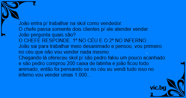 Chegando lá ofereceu skol p/ são pedro falou um pouco acanhado e são pedro comprou 200 caixa de latinha e joão ficou todo animado, então foi pensando se no céu eu vendi tudo isso no inferno vou vender umas 1.000 Caixinhas, chegando lá ja foi batendo na costa do capeta e falando. E ai capetão tudo bem sou vendedor da skol tô numa promoção excelente na cerveja quantos caminhão de cerveja mando p/ o senhor? e o capeta responde. Somente 02 caixas.