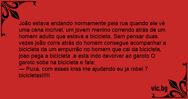 João estava andando normamente pela rua quando ele vê uma cena incrivel, um jovem menino correndo atrás de um homem adulto que estava a bicicleta. Sem pensar duas vezes joão corre atrás do homem consegue acompanhar a bicicleta da um empurrão no homem que cai da bicicleta, joao pega a bicicleta ,e esta indo devolver ao garoto O garoto sobe na bicicleta e fala: