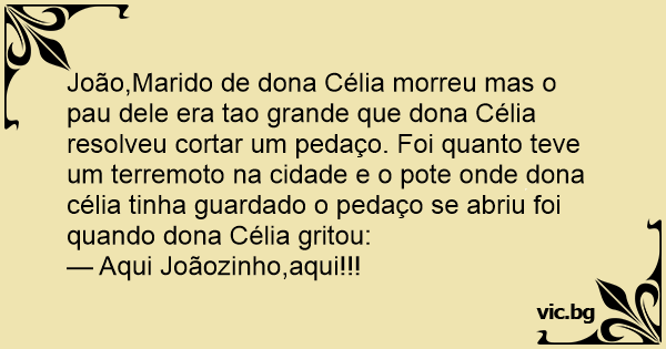 João,Marido de dona Célia morreu mas o раu dele era tao grande que dona Célia resolveu cortar um pedaço. Foi quanto teve um terremoto na cidade e o pote onde dona célia tinha guardado o pedaço se abriu foi quando dona Célia gritou: