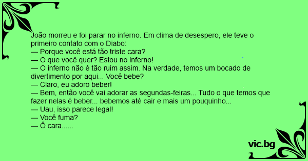 João morreu e foi parar no inferno. Em clima de desespero, ele teve o primeiro contato com o Diabo:
