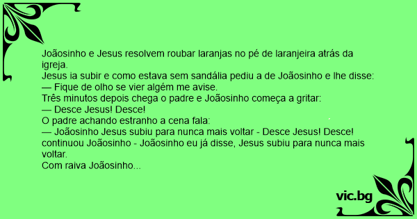 — Joãosinho Jesus subiu para nunca mais voltar - Desce Jesus! Desce! continuou Joãosinho - Joãosinho eu já disse, Jesus subiu para nunca mais voltar.