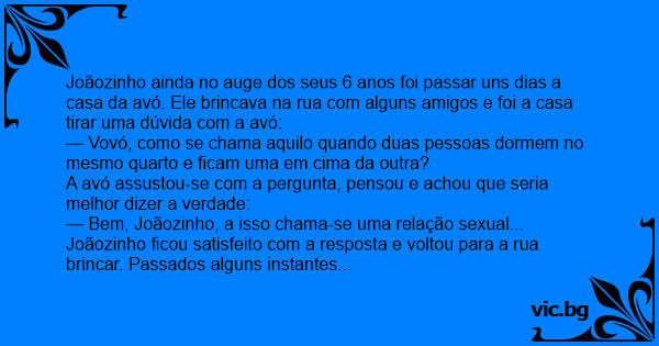 Joãozinho ainda no auge dos seus 6 anos foi passar uns dias a casa da avó. Ele brincava na rua com alguns amigos e foi a casa tirar uma dúvida com a avó: