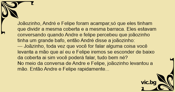 Joãozinho, André e Felipe foram acampar,só que eles tinham que dividir a mesma coberta e a mesma barraca. Eles estavam conversando quando Andre e felipe percebeu que joãozinho tinha um grande bafo, então André disse a joãozinho: