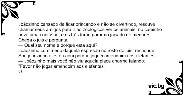 Joãozinho cansado de ficar brincando e não se divertindo, resouve chamar seus amigos para ir ao zoologicos ver os animais. no caminho ouve uma confusão, e os três forão parar no juisado de menores.