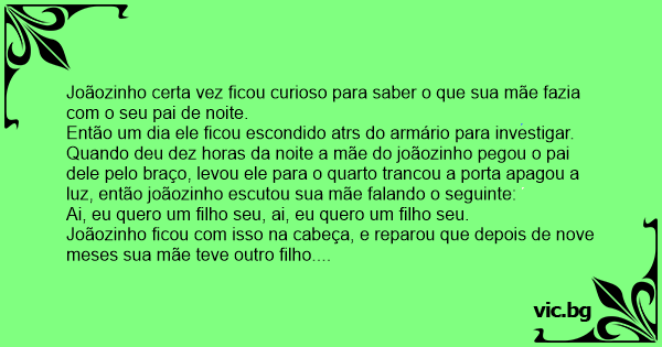 Então um dia ele ficou escondido atrs do armário para investigar. Quando deu dez horas da noite a mãe do joãozinho pegou o pai dele pelo braço, levou ele para o quarto trancou a porta apagou a luz, então joãozinho escutou sua mãe falando o seguinte: