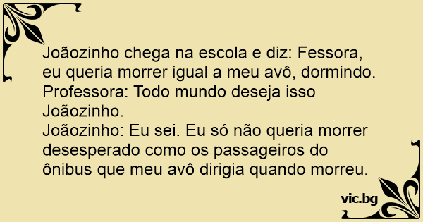 Joãozinho chega na escola e diz: Fessora, eu queria morrer igual a meu avô, dormindo.