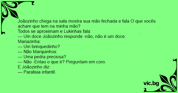 Joãozinho chega na sala mostra sua mão fechada e fala O que vocês acham que tem na minha mão?