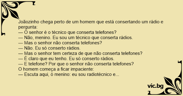 Joãozinho chega perto de um homem que está consertando um rádio e pergunta: — O senhor é o técnico que conserta telefones? — Não, menino. Eu sou um técnico que conserta rádios. — Mas o senhor não conserta telefones? — Não. Eu só conserto rádios. — Mas o senhor tem certeza de que não conserta telefones? — É claro que eu tenho. Eu só conserto rádios. — E telefone? Por que o senhor não conserta telefones? O homem começa a ficar impaciente: — Escuta aqui, ó menino: eu sou radiotécnico e só conserto rádios. — Mas é que me disseram que o senhor consertava telefones. Aí o homem perde a paciência: — Está bem! Eu sou um radiotécnico que conserta telefones. Agora está satisfeito? — Ah, bom... Então me diga uma coisa: e o que é que o senhor tá fazendo aí com esse rádio?