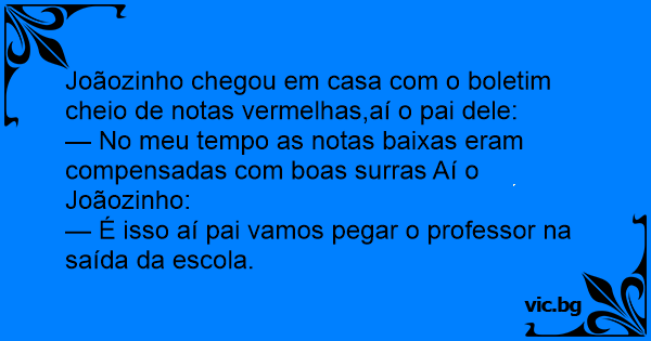 — No meu tempo as notas baixas eram compensadas com boas surras Aí o Joãozinho: