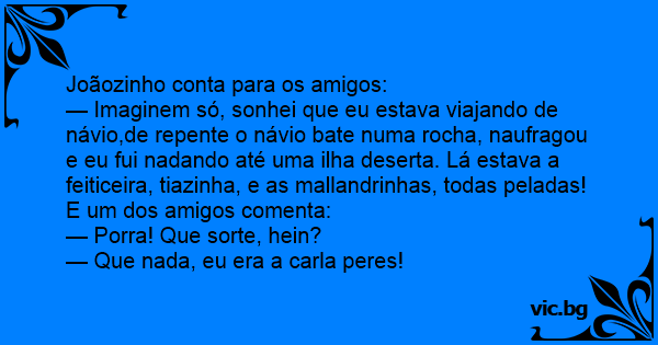 — Imaginem só, sonhei que eu estava viajando de návio,de repente o návio bate numa rocha, naufragou e eu fui nadando até uma ilha deserta. Lá estava a feiticeira, tiazinha, e as mallandrinhas, todas peladas!