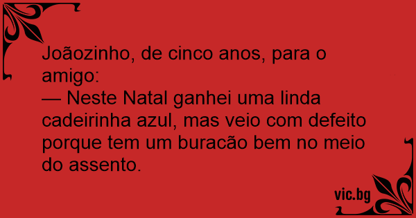 — Neste Natal ganhei uma linda cadeirinha azul, mas veio com defeito porque tem um buracão bem no meio do assento.