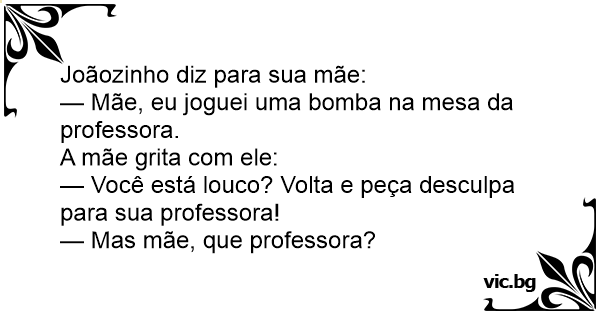 — Mãe, eu joguei uma bomba na mesa da professora.