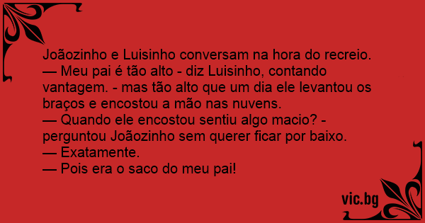 — Quando ele encostou sentiu algo macio? - perguntou Joãozinho sem querer ficar por baixo.