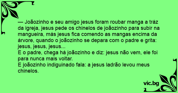 — Joãozinho e seu amigo jesus foram roubar manga a tráz da igreja, jesus pede os chinelos de joãozinho para subir na mangueira, más jesus fiса comendo as mangas encima da árvore, quando o joãozinho se depara com o padre e grita: jesus, jesus, jesus...